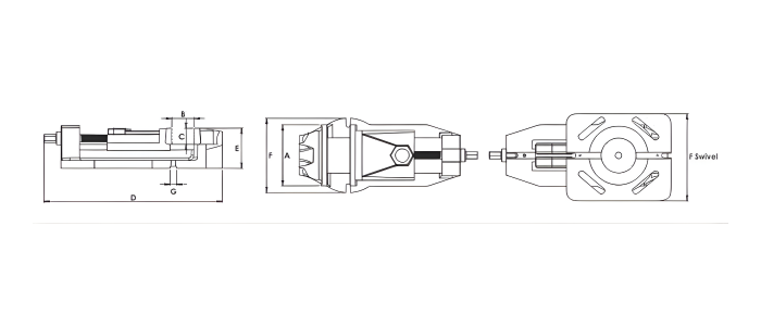 | Jaw Width (MM) | Opening (MM) | MM | MM | E (Swivel) MM | F (Swivel) MM | G MM | Swivel Weight (Kgs.) | Clamping Pressure (KGF) |