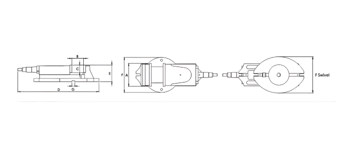 | Jaw Width (MM) | Opening (MM) | MM | MM | E (Swivel) MM | F (Swivel) MM | G MM | Swivel Weight (Kgs.) |