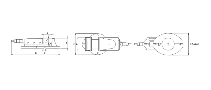 | Jaw Width (MM) | Opening (MM) | MM | MM | E (Swivel) MM | F (Swivel) MM | G MM | Swivel Weight (Kgs.) |