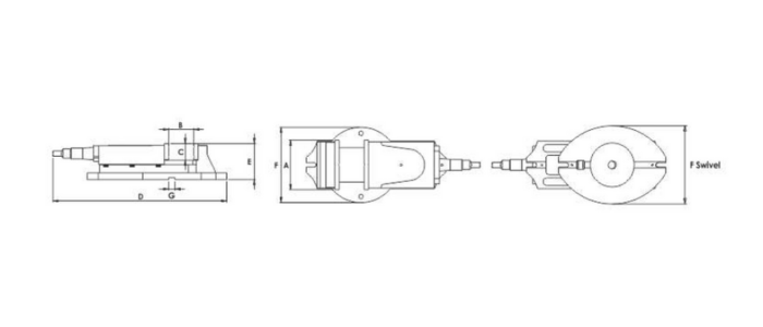 | Jaw Width (A) | Opening (B) | C | D (Swivel) | E (Swivel) | F (Swivel) | Weight (Kgs.) Swivel |
