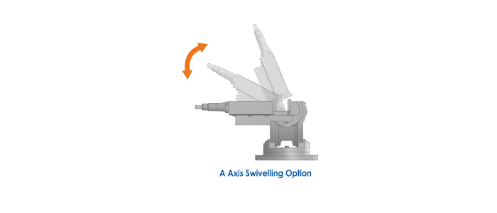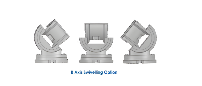 - B-Axis (Middle): Inclines ±45° for compound angle machining, perpendicular to the swivel movement.
